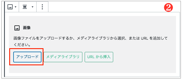 パソコンなどに保存されている画像・イラストを挿入したいときは、[アップロード❷]をクリックします。