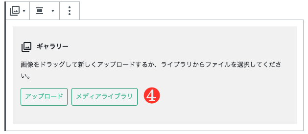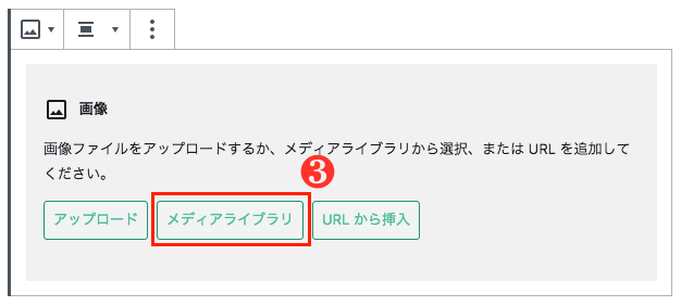 すでに追加済みの画像・イラストを挿入したいときは、[メディアライブラリー❹]をクリックします。
