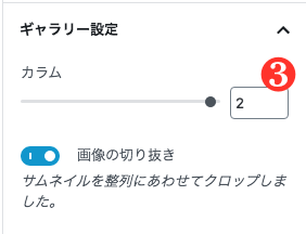 2枚目を挿入したとき、右メニューに一列に並ぶ枚数を設定する[カラム]❸が表示されるので、数値を入れる。