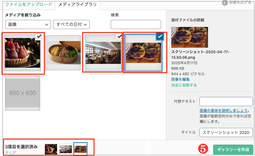 挿入したい画像をすべて選択し、右下の[ギャラリーを作成]❺をクリックします。