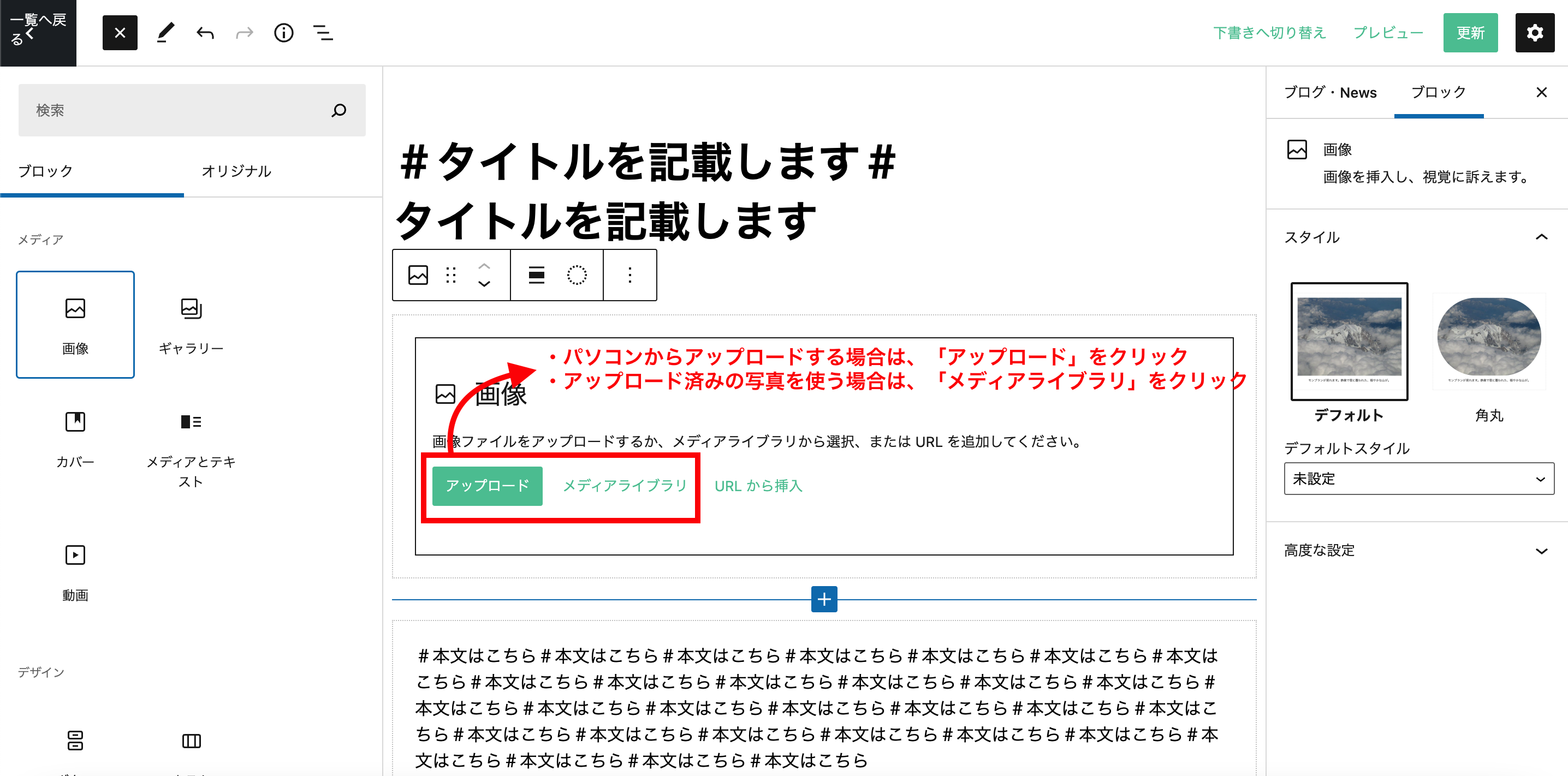 ③パソコンからアップロードする場合は「アップロード」をクリック。すでにアップロードされている写真を使用する場合は「メディアライブラリ」をクリックします。