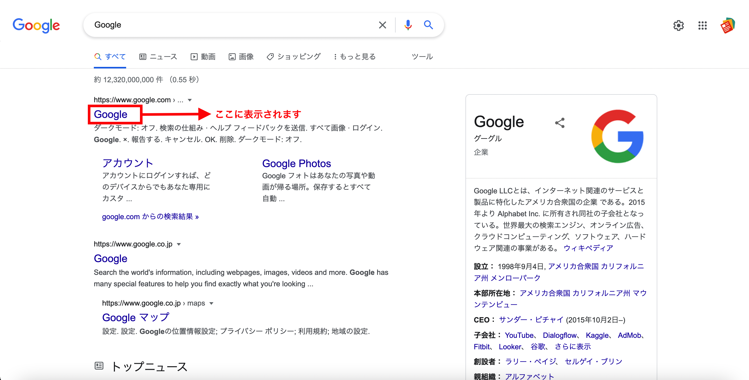 「SEO設定」で設定したタイトルは、Google等の検索エンジンにて検索された時に表示されるページタイトルです。以下の画像の位置に表示されます。