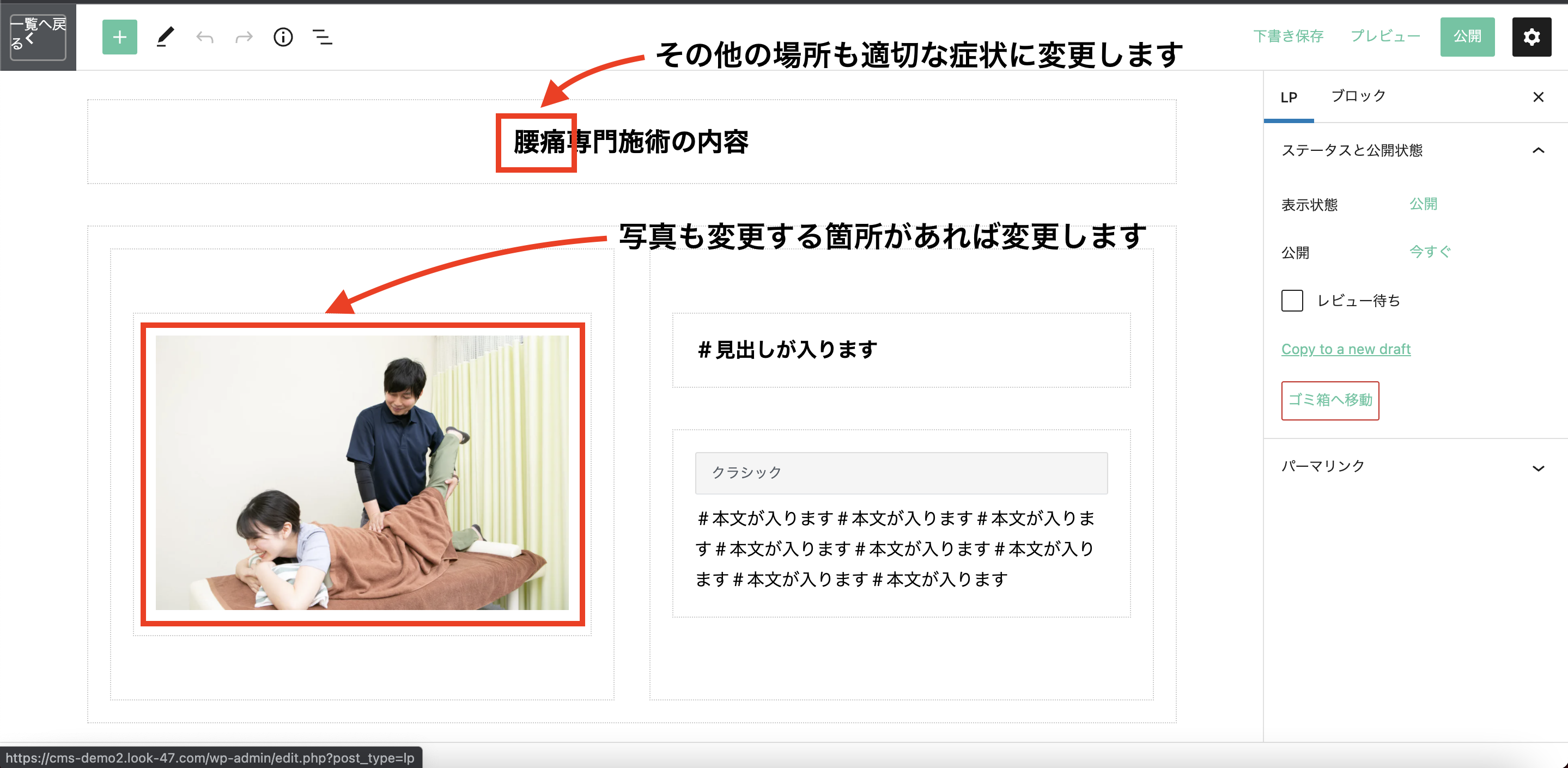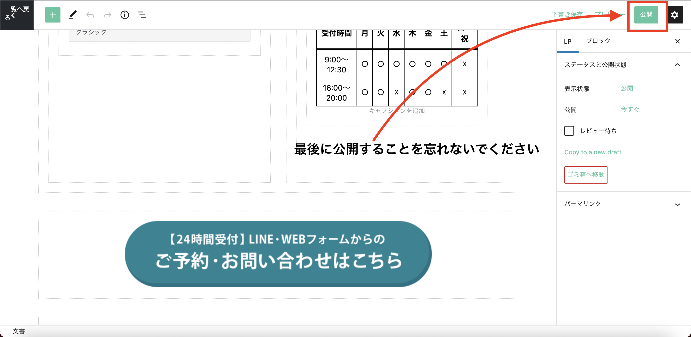 ⑥完成したら【公開する】ボタンを押し、出来上がったページを確認して、症状ページの作成は終了です。