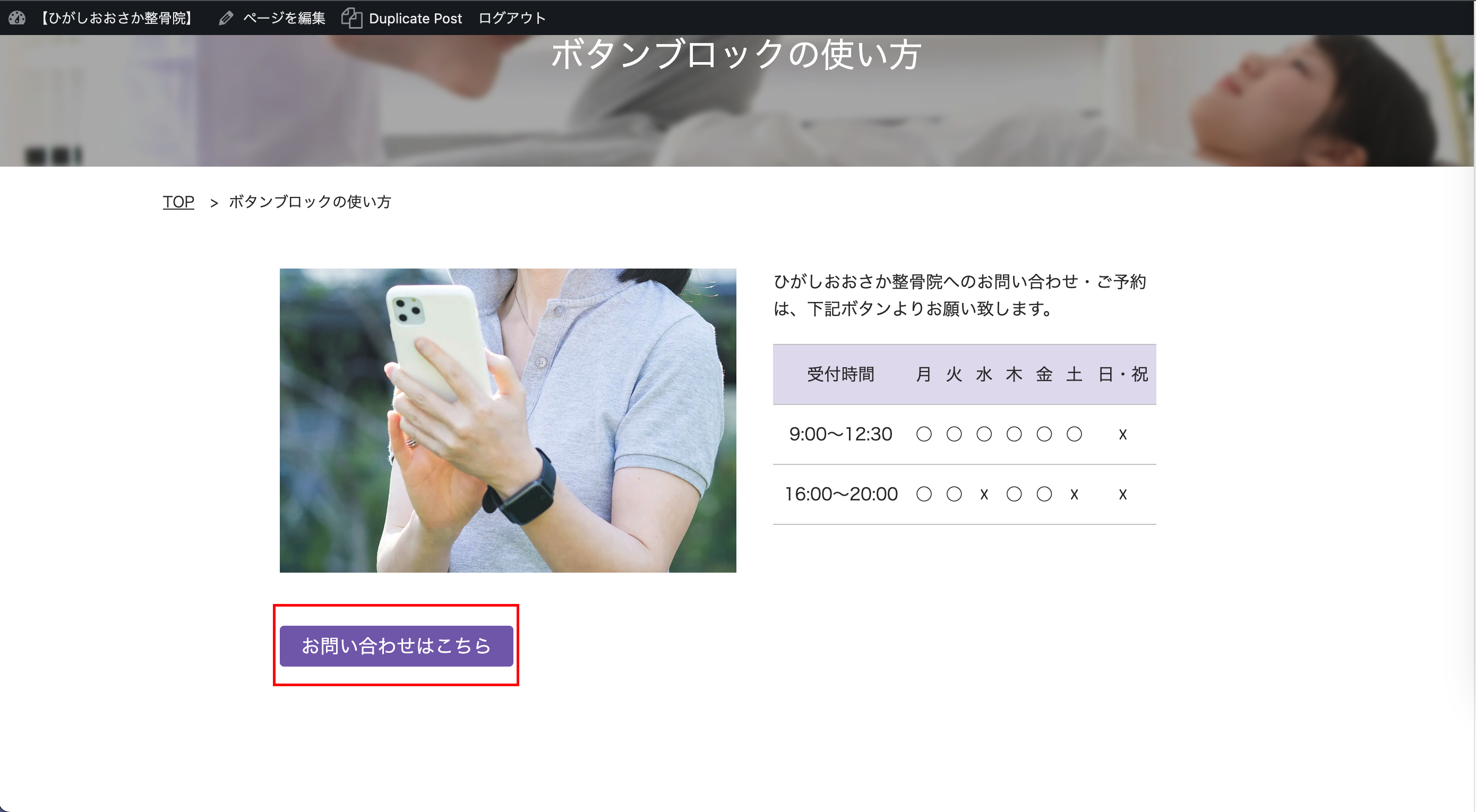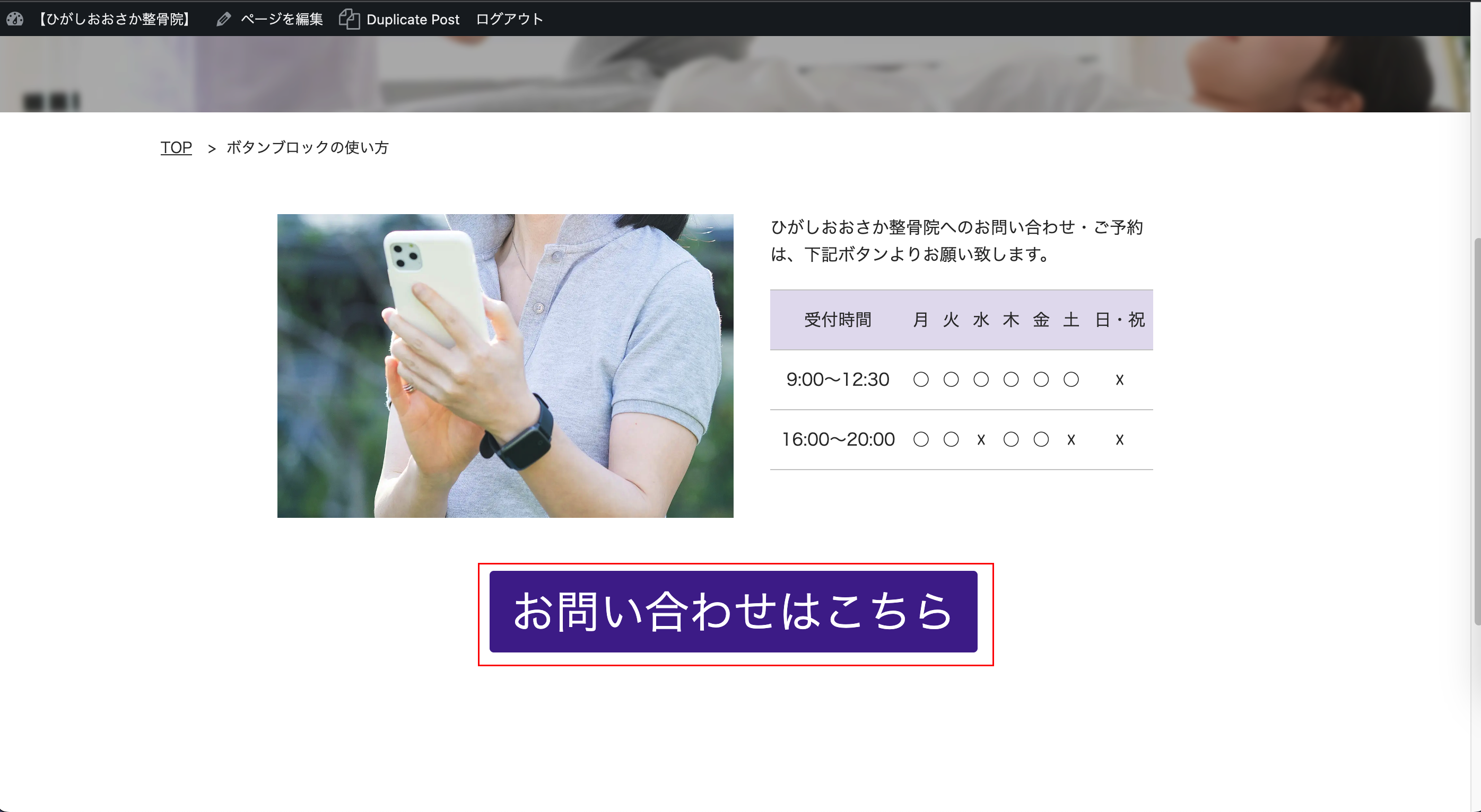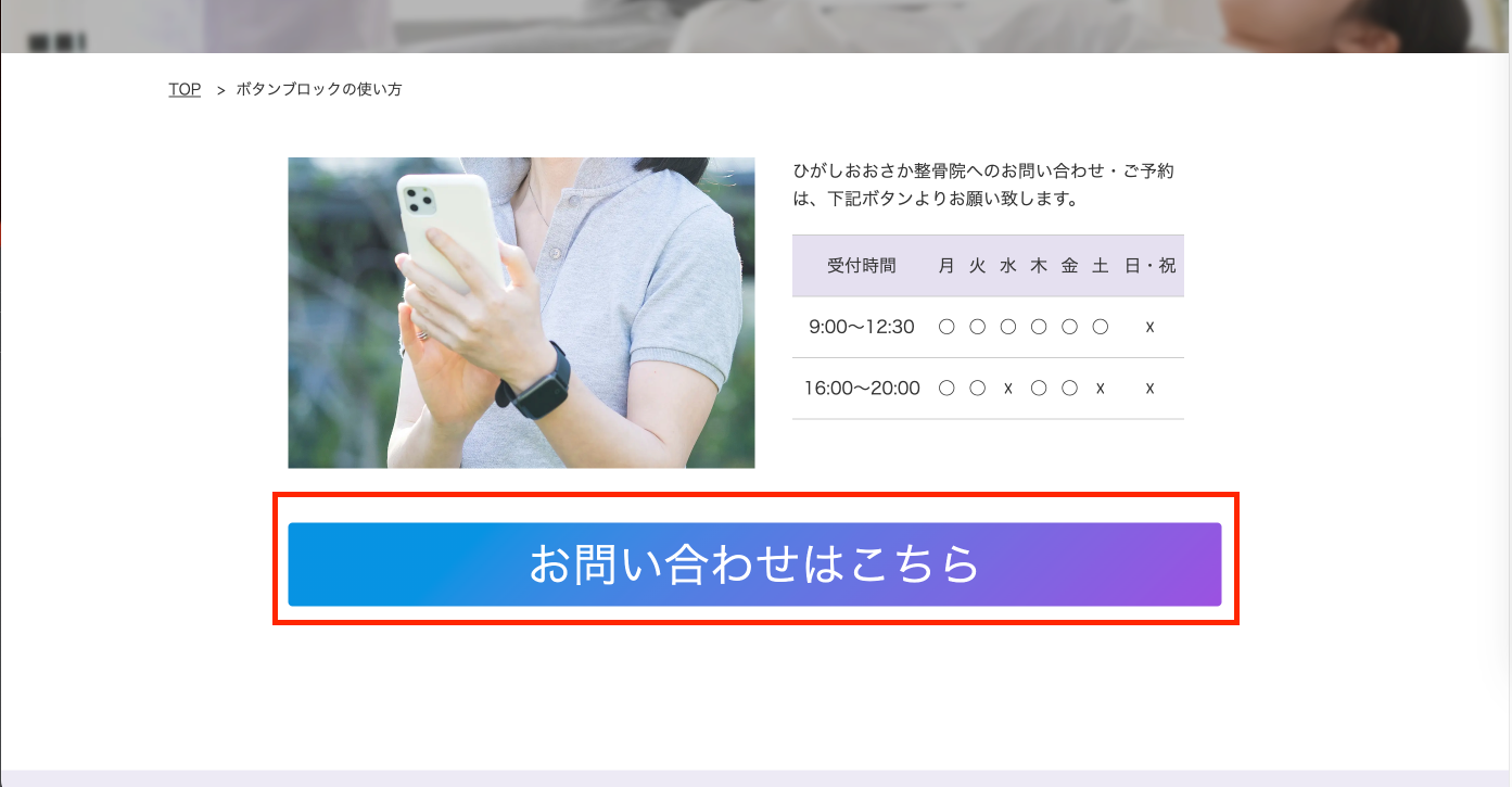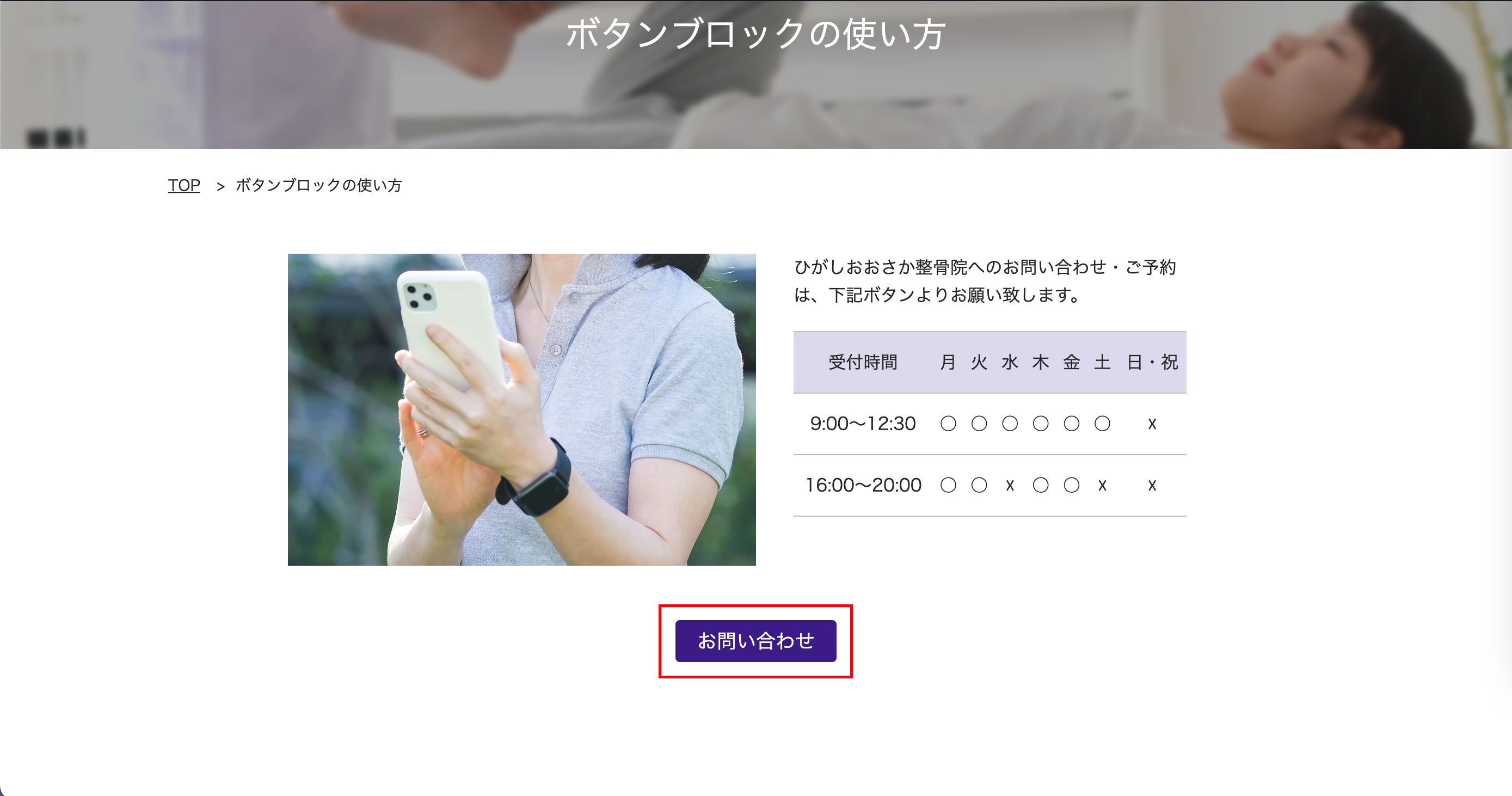 以上がボタンブロックの解説となります。ボタンブロックを活用し、ホームページユーザーを導くことで集患に取り組んでいきましょう。