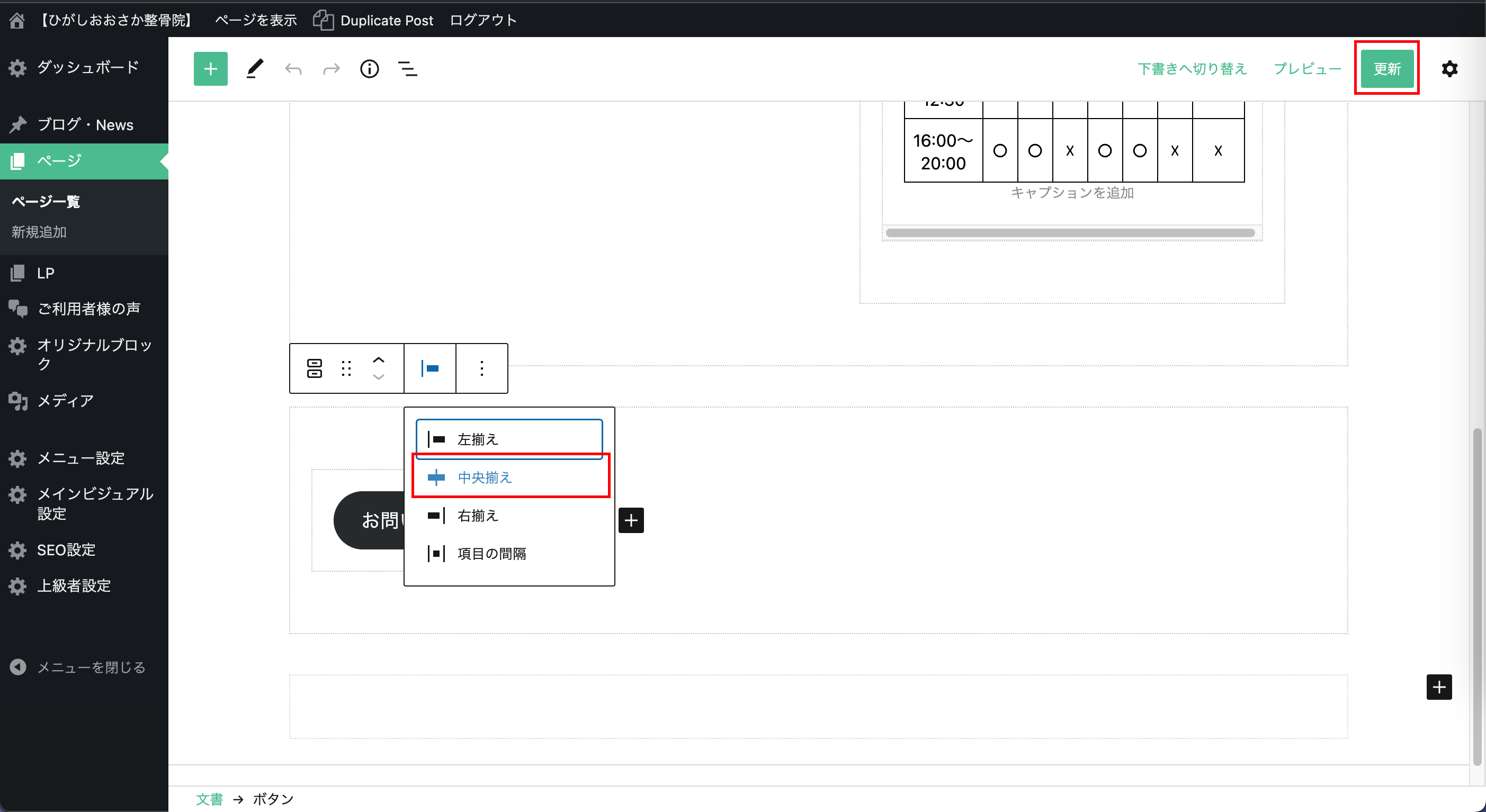 3,「中央揃え」を選択して更新ボタンを押して完了です。
