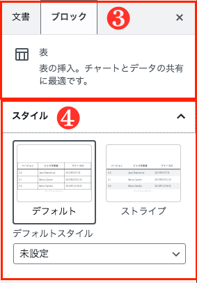❸設定メニュー(右メニュー)のブロックでは、さまざまな表組のスタイルを設定できます。