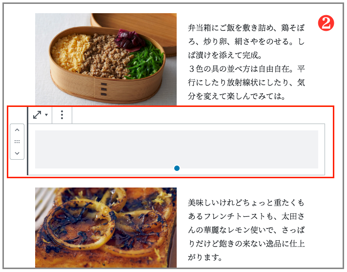 青の点にカーソルを置いて、つかみながら上下に動かすと、グレーの縦幅の高さが変わり、自在にスペース面積を調節することができます❸。
