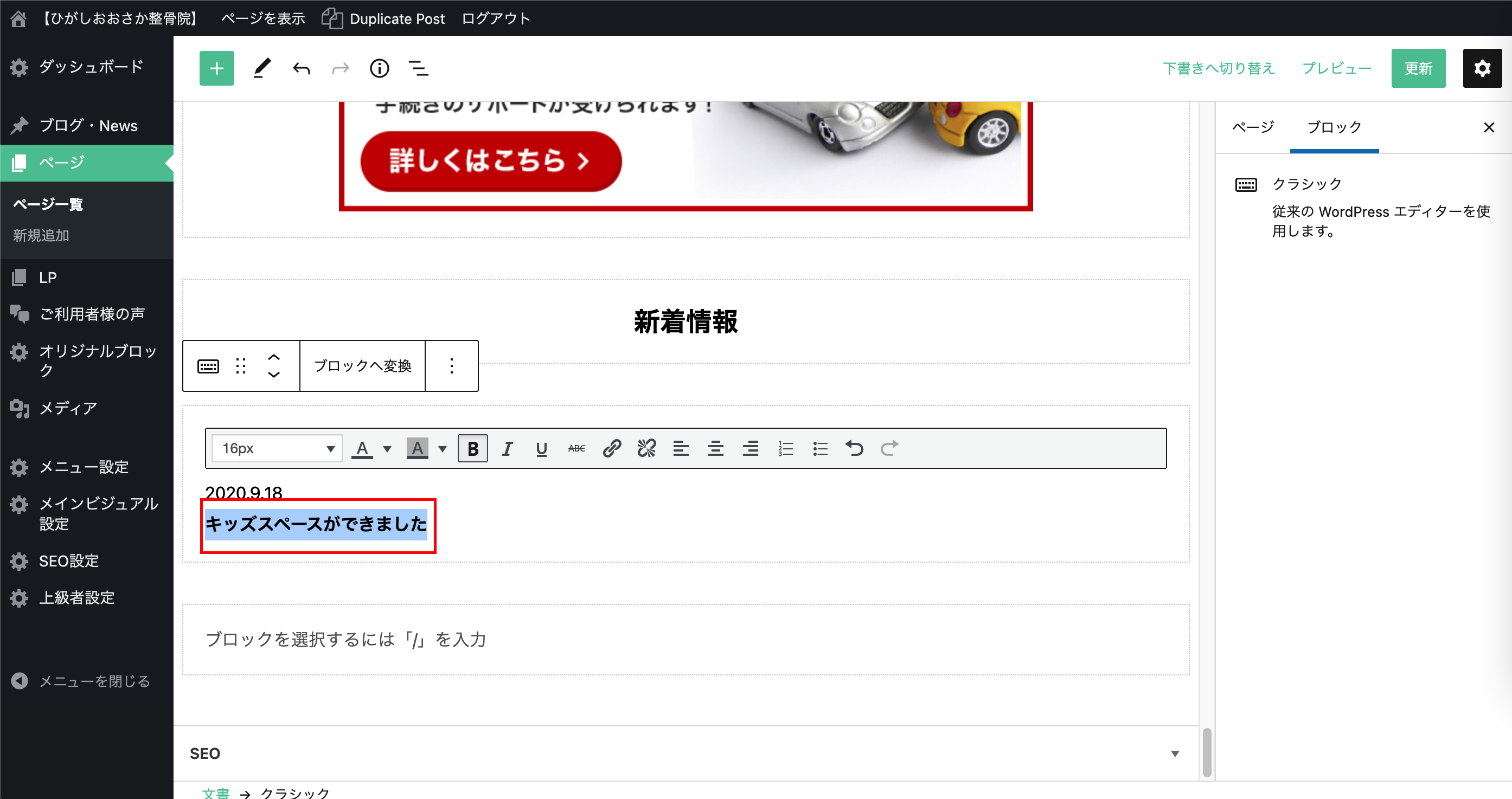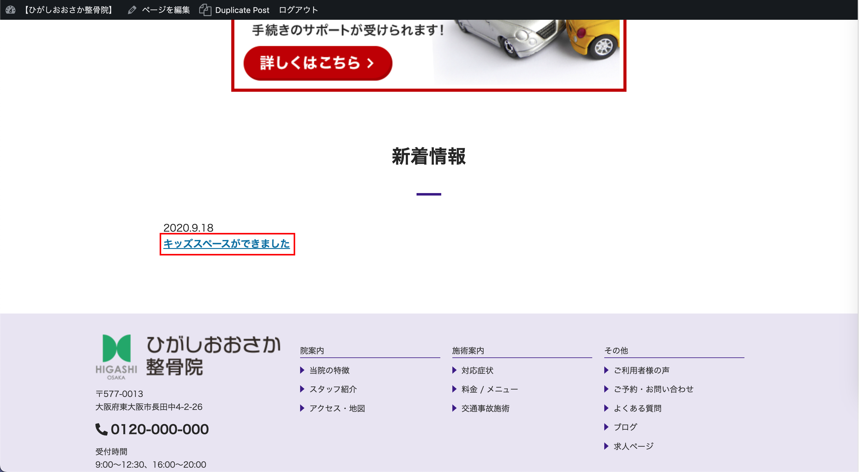 また、TOPページの新着情報の更新をした際に別ページの任意の箇所にリンクさせることもできます。