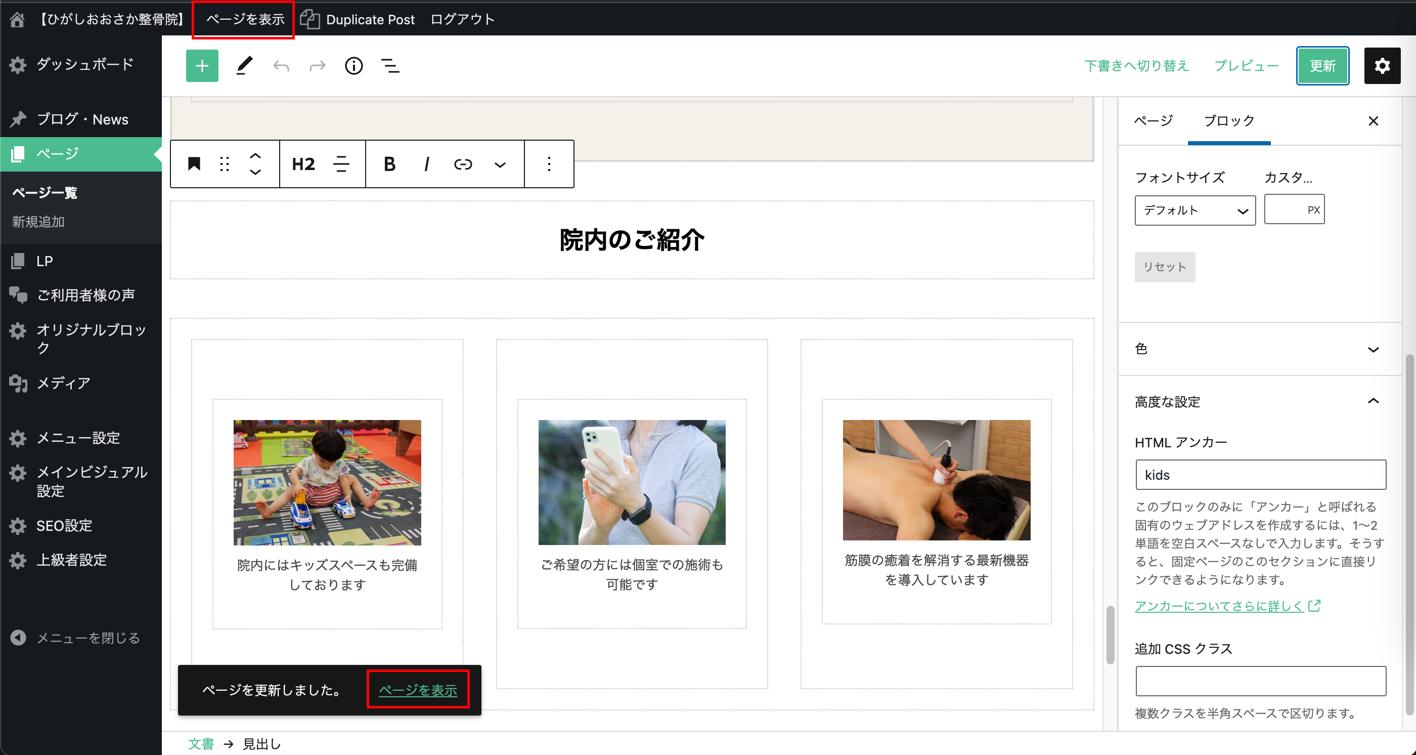 5,「HTML アンカー」に任意のIDを打ち込み、更新ボタンを押します。